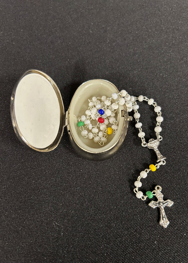 This rosary set features: A Small Rosary with White Glass Beads and Multicolor Our Father Beads, an Oxidized Chalice Center. The Rosary fits perfectly inside an Oval First Communion box. Makes a Great First Communion Gift.