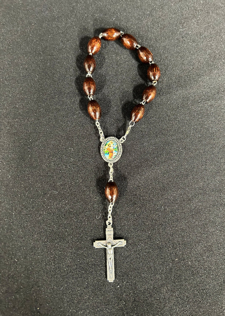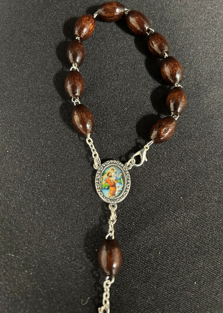 Saint Christopher is the patron saint of travelers. This one decade rosary can be used as an auto rosary, including a clasp making it easy to hang in your vehicle.